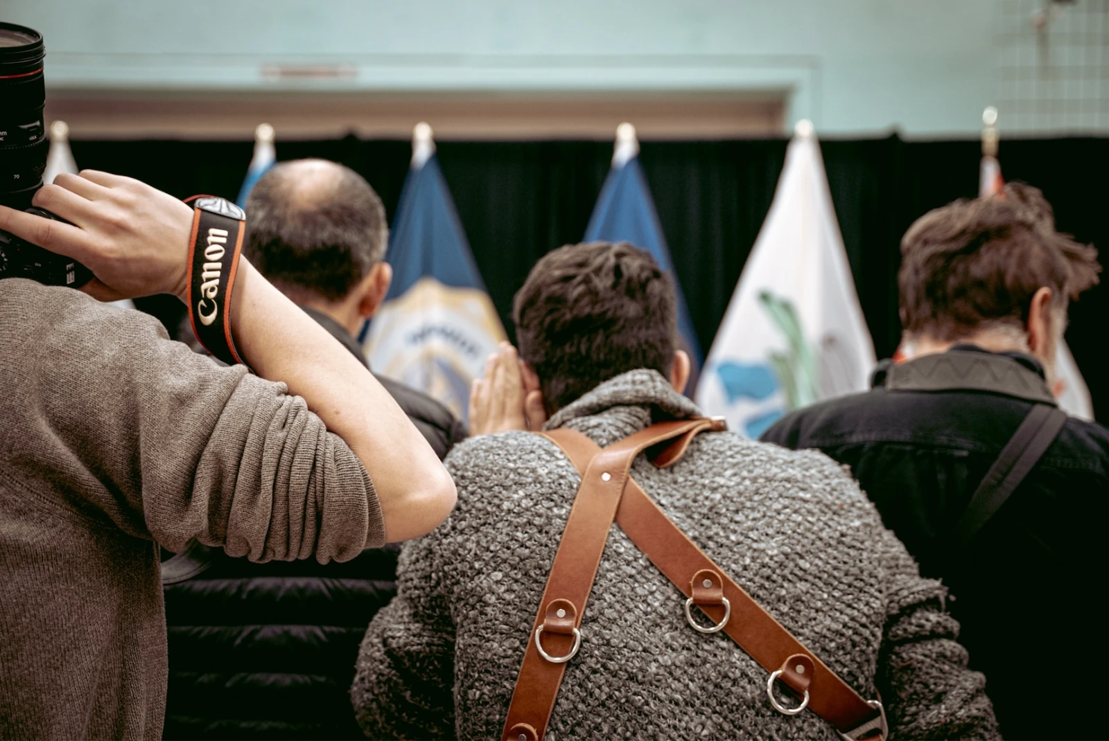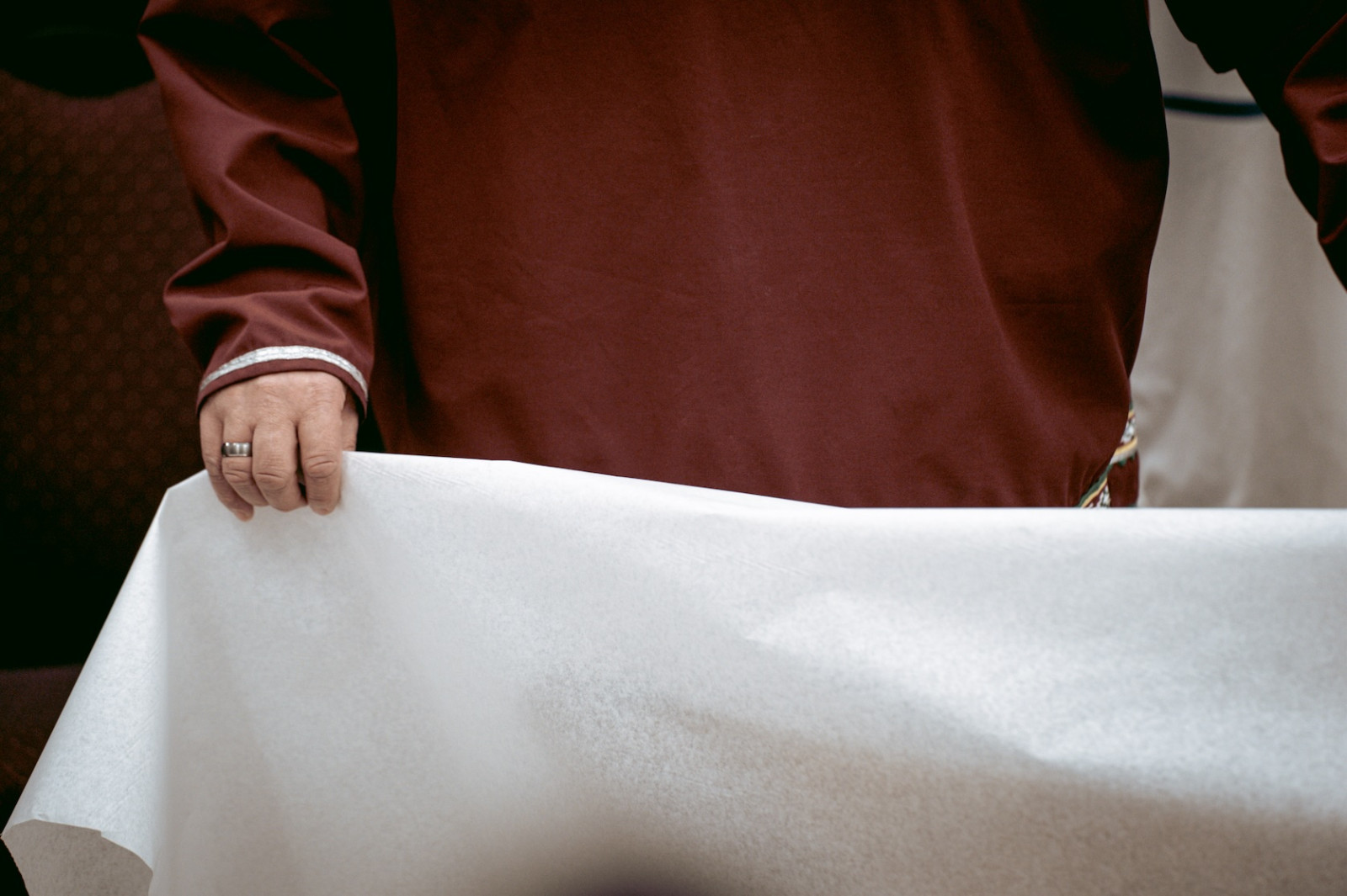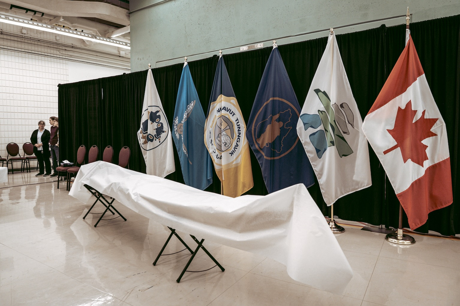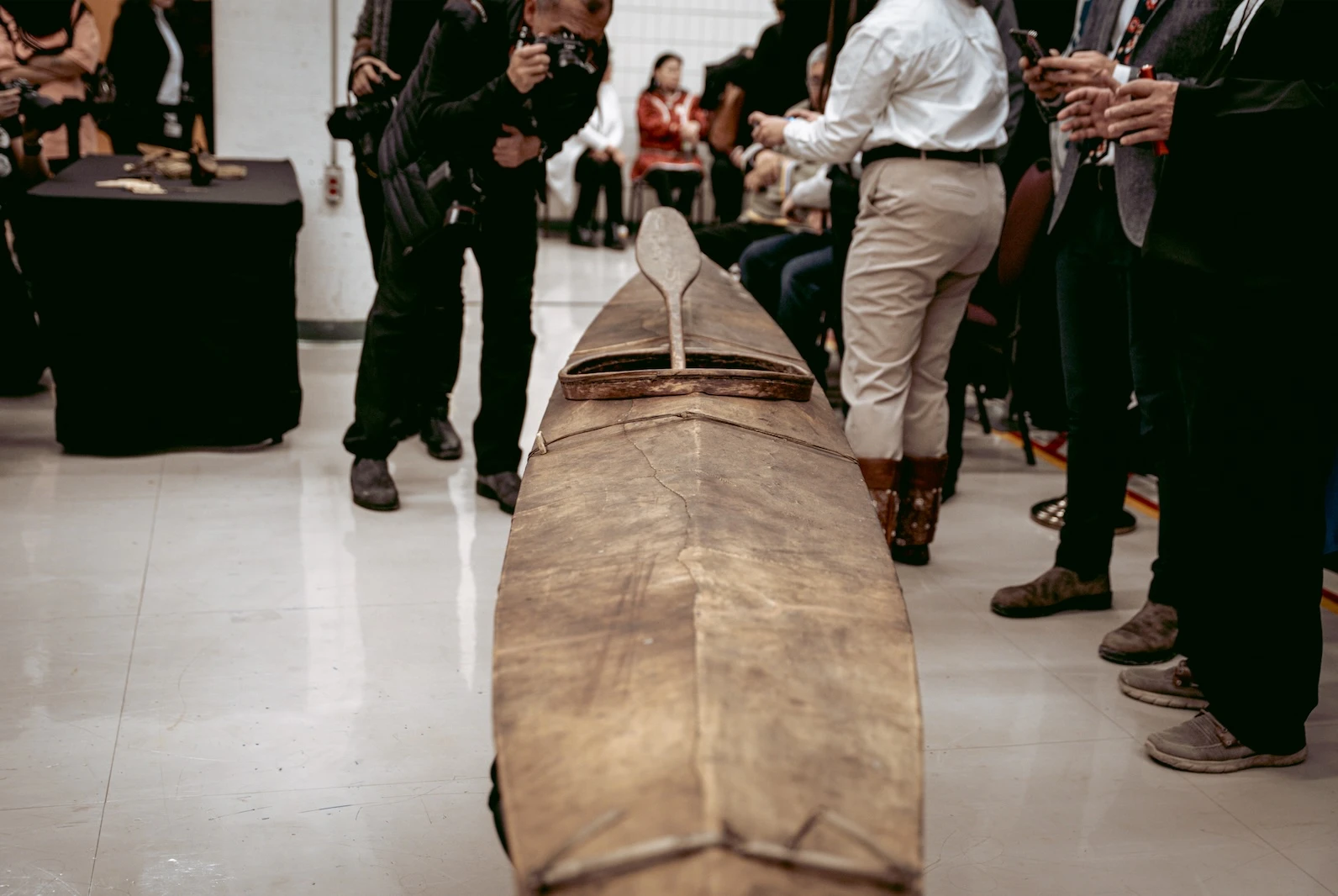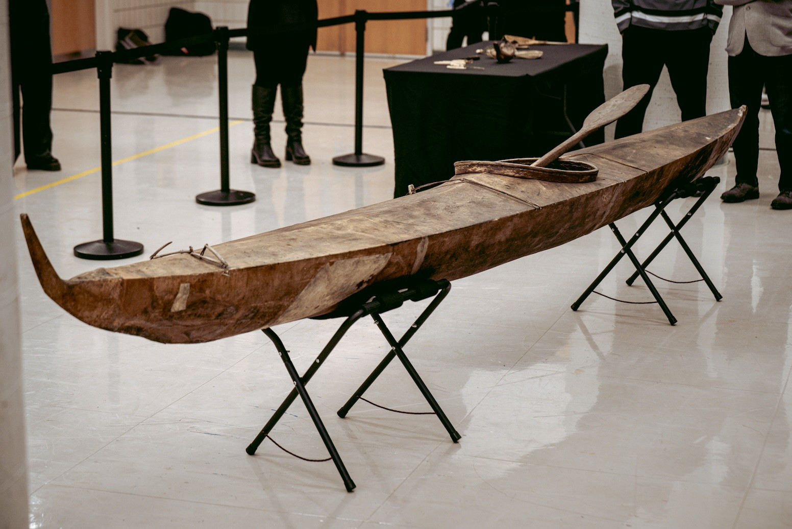 Derrière un cordon, les cameramen des grands réseaux canadiens plantent leurs trépieds. Devant eux, on devine la silhouette d’un kayak dissimulé sous un drap blanc. À côté, une table, autre drap, même pudeur, où reposent d’autres pièces tout droit revenues du Vatican. Cent ans d’exil sous un tissu.