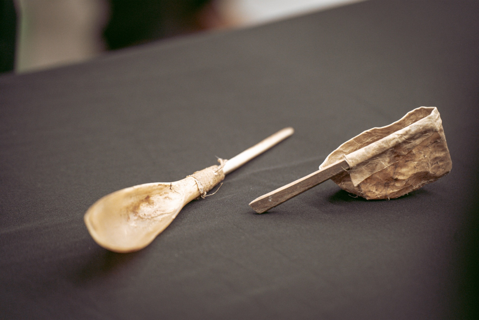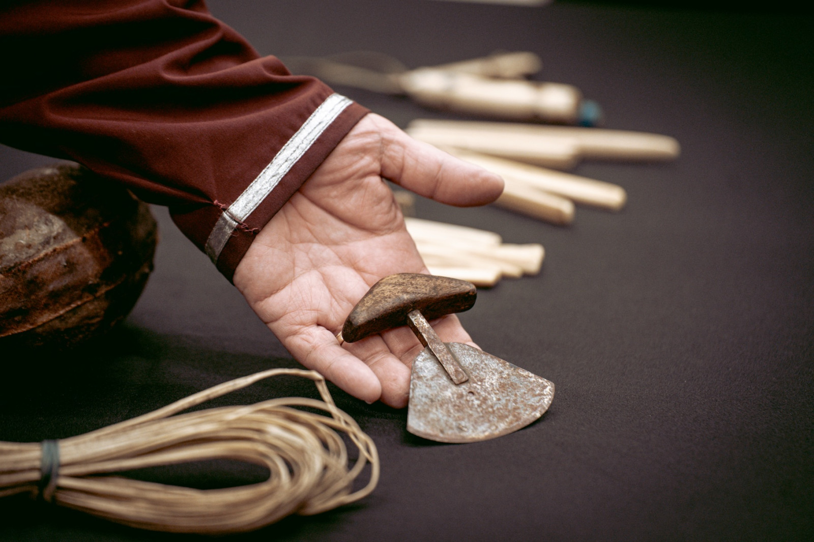 Parmi les objets dévoilés mardi, on retrouve des gourdes en peau de bœuf musqué, une cuillère, des trousses de couture, du cordage, une lame traditionnelle — le ulu —, ainsi que des pointes de harpon.
