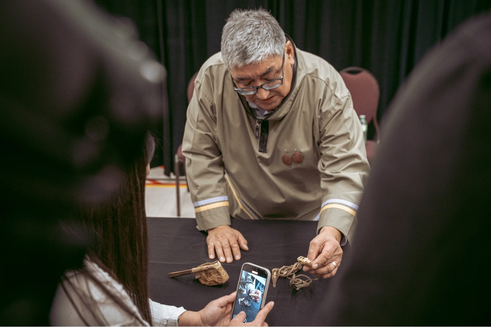 La veille, au moment où les premières boîtes ont été ouvertes, il y a eu, raconte au micro Nathan Obed, un léger choc de protocoles que le président de l’Inuit Tapiriit Kanatami résume ainsi : « Je crois que certains membres du personnel ont été un peu déstabilisés de nous voir manipuler les objets à mains nues. Les normes en vigueur dans vos institutions ne sont pas les mêmes que les nôtres lorsqu’il est question de respect de notre héritage. Pour nous, ces objets doivent être touchés. Ça fait partie du processus de réconciliation. »