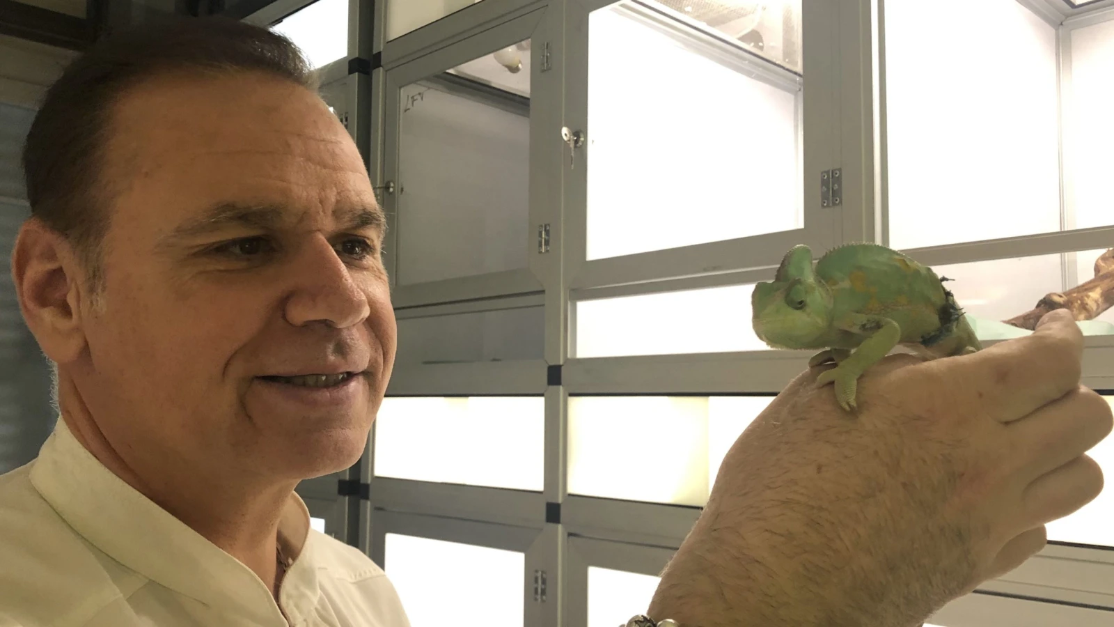 Dans la salle de repos des reptiles, tout le monde dort sauf les tortues qui font du vacarme avec leurs griffes, animée par les lampes UV qui les réchauffent. Derrière les vitres, un python rouge, malade d’un œil, attend des jours meilleurs enroulé sur lui-même (« il est pas très sympa », nous dit-on). De l’autre côté du couloir, une femelle caméléon tout juste stérilisée escalade le bras du docteur.