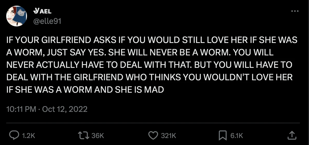 Le scénario est fictif, né d’une publication humoristique postée en 2019 sur X par une certaine shutyourhell, mais la phrase, elle, devient instantanément virale sur Internet. Si elle n’est pas récupérée sous la forme de memes, elle peuple alors les TikToks de couples, apparaît dans des fan arts ou inspire le fameux costume d’Halloween de l’ex-mannequin américaine Heidi Klum.