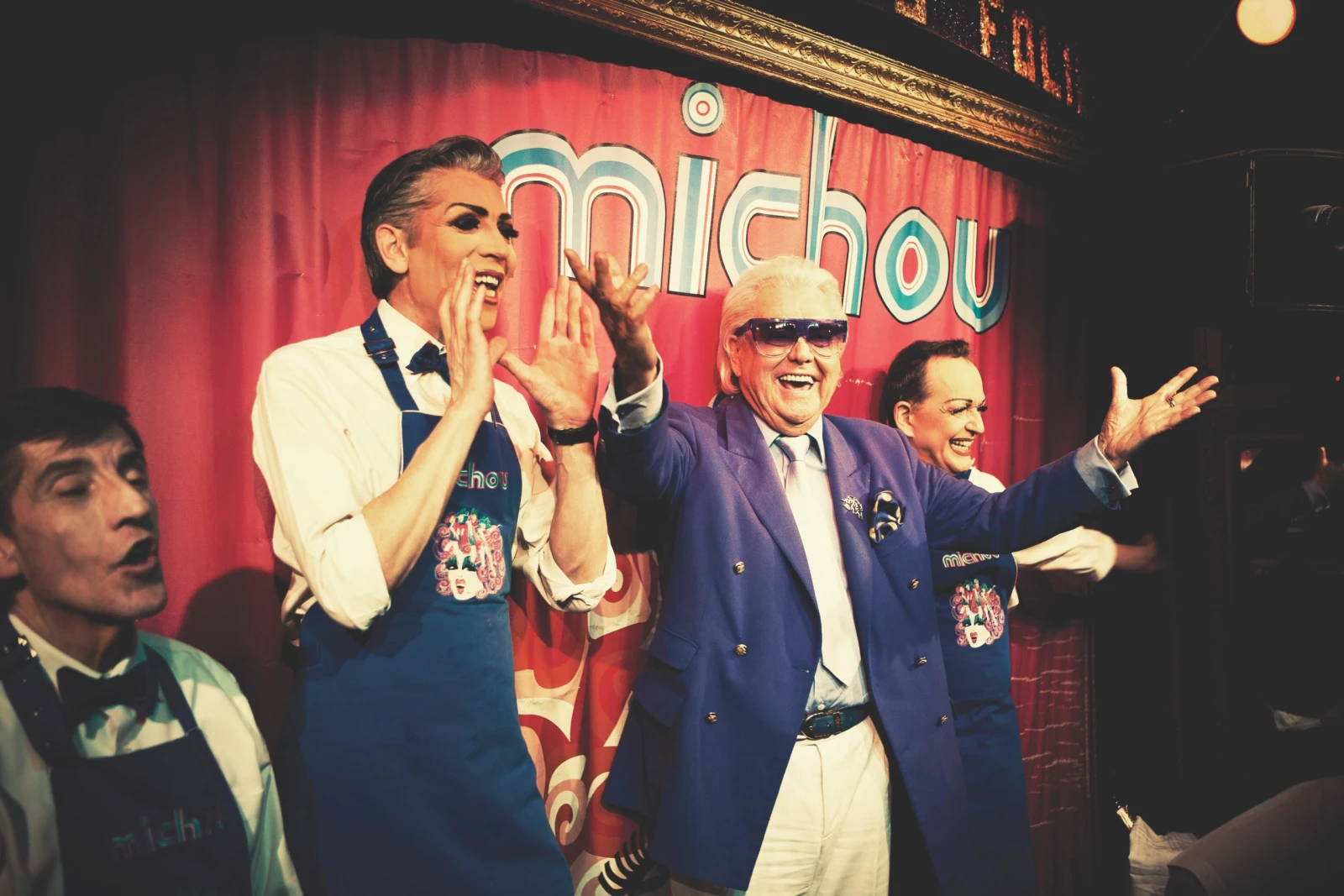 Michou était bel et bien sur place. Impossible à manquer avec son veston bleu, sa chemise bleue, sa cravate bleue, ses pantalons bleus, ses souliers bleus et sa crinière bleue blanche. Bleu étant sa couleur préférée. (J’apprendrai plus tard que TOUTE sa garde-robe est bleue et que son appartement l’est aussi.) À Paris, certains parlent même d’un «bleu Michou».
