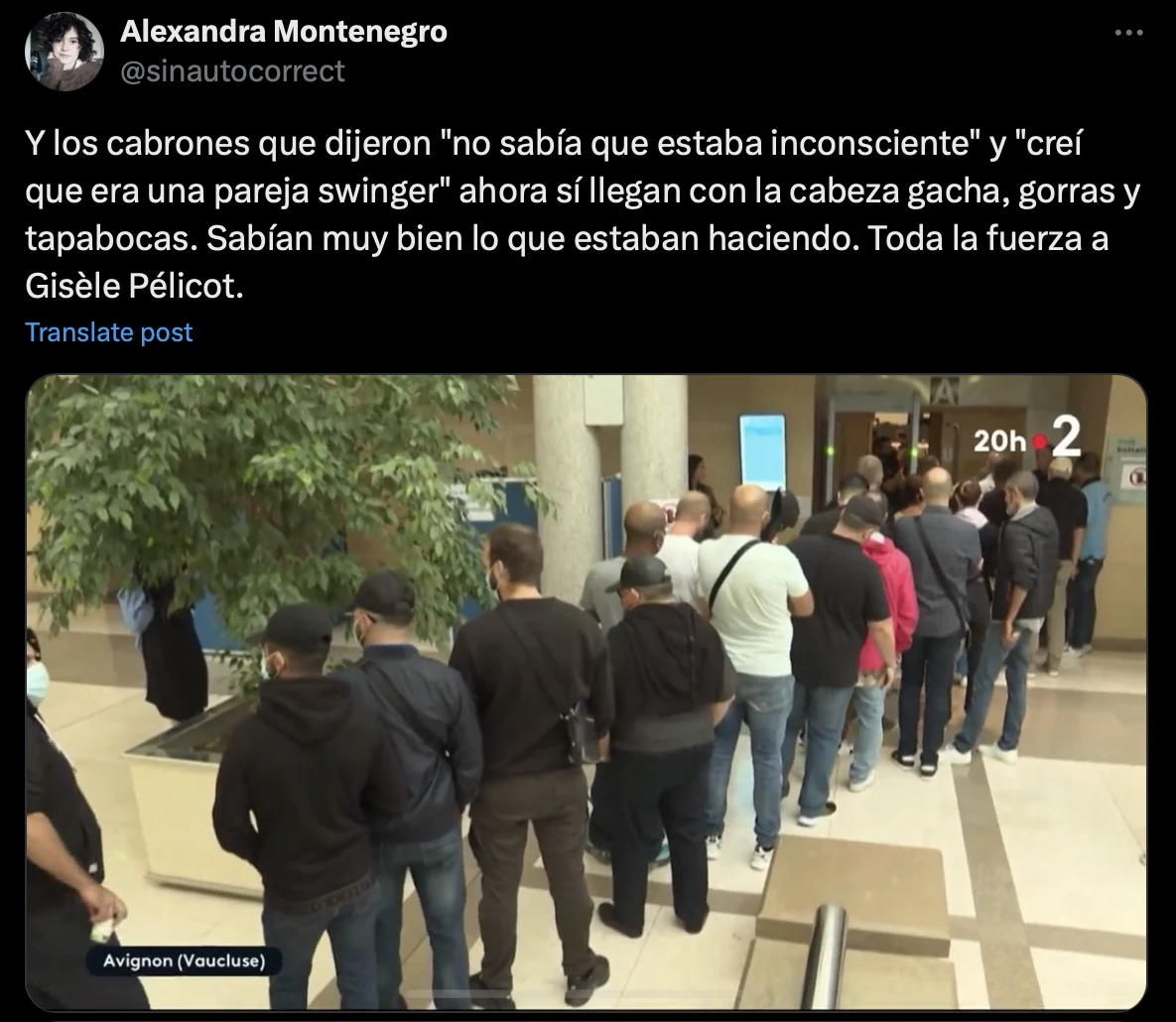 Tombe sur une image tirée d’un reportage France 2 et relayée par une publication colombienne virale, dans laquelle une cinquantaine d’accusés patientent devant la salle d’audience du procès Mazan, entamé le 2 septembre.