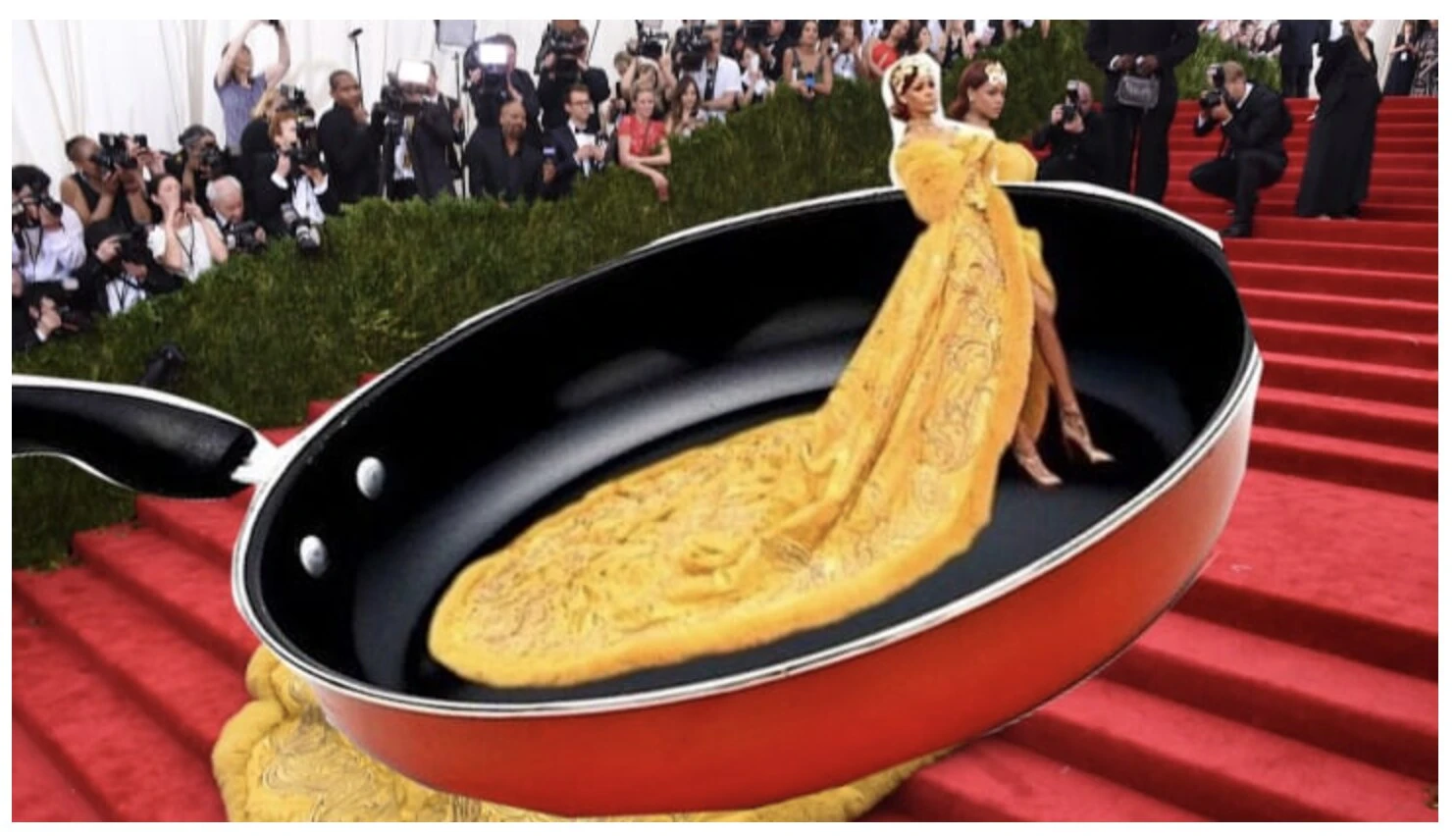 Rihanna est également une incontournable du tapis rouge, autant pour ses tenues que pour l’accessoire indispensable qui les accompagnent : son audace. Là encore, l’édition 2018 du MET Gala en est la parfaite illustration. La chanteuse y est apparue en Pape, toque incluse, dans une tenue Maison Margiela de 750 heures de main-d’oeuvre. L’année précédente, c’était une robe déstructurée Comme des Garçons en confettis rouges qui lui avait valu la couronne des festivités. Et l’année d’avant encore, sa fameuse tenue « omelette » dotée d’une traîne de cinq mètres s’était imposée reine de la soirée — et des memes.