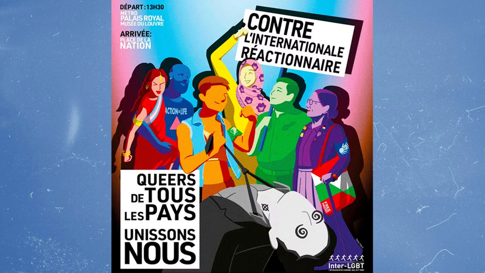 La stupéfaction m’envahit. Comment donc ? Qu’ouïs-je ? La Pride serait… politique ? Des voix se sont élevées en réaction à l’affiche de la Marche des fiertés 2025 de Paris, publiée par l’Inter-LGBT et dessinée par l’artiste Tola Vart, pour dénoncer un trop-plein de « trop » : « trop politique », « trop violente », « trop radicale ». Sur l’image, on distingue six personnages aux couleurs du drapeau LGBTQ+. Parmi elleux, un militant d’Act Up, une femme portant le voile, une autre arborant plusieurs badges, dont un aux couleurs du drapeau palestinien. Un autre personnage vient visiblement d’assommer un homme qui, au vu de la croix celtique tatouée sur son cou, symbolise le fascisme.