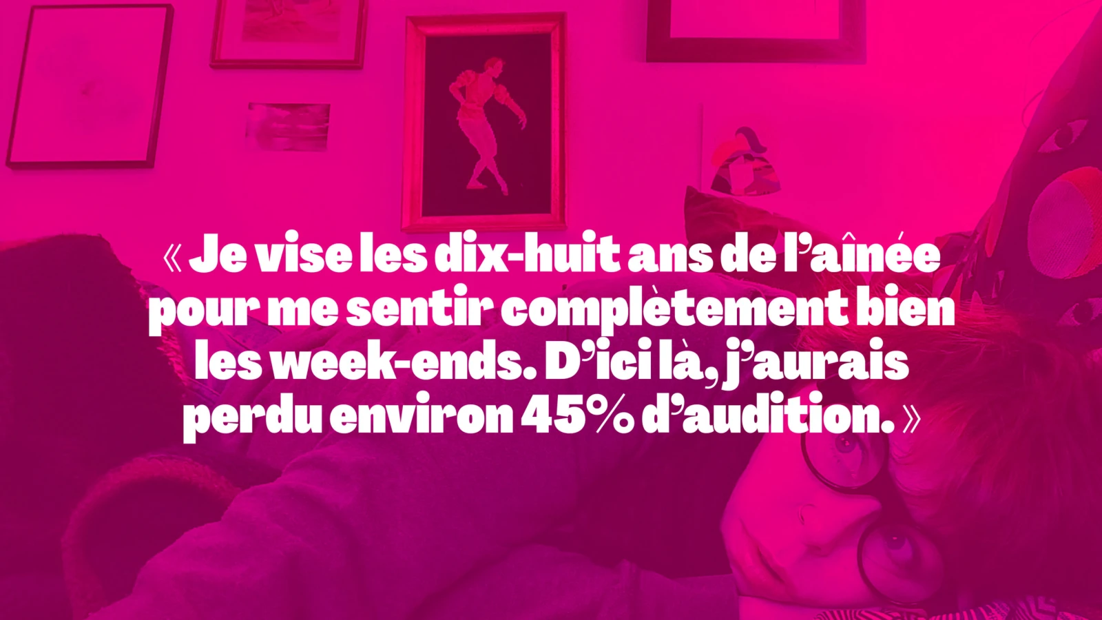 En moi, je puise l’énergie et la force mentale pour ne pas râler, pleurer, m’arracher les cheveux et pour que le week-end se déroule à peu près paisiblement et que chaque membre de notre famille se sente bien. Ok, j’admets que c’est un peu plus facile maintenant. Je vise les dix-huit ans de l’aînée pour me sentir complètement bien les week-ends. D’ici là, j’aurais perdu environ 45% d’audition à cause des cris des enfants, toute ma libido, mes quelques économies, j’aurais plus de cheveux gris et mes cernes tomberont jusqu’à mes genoux et j’aurais vingt-quatre abonnements à des sites de streaming, je n’aurais plus envie d’aller à des concerts et je me nourrirais uniquement de pâte à tartiner. Vivement !