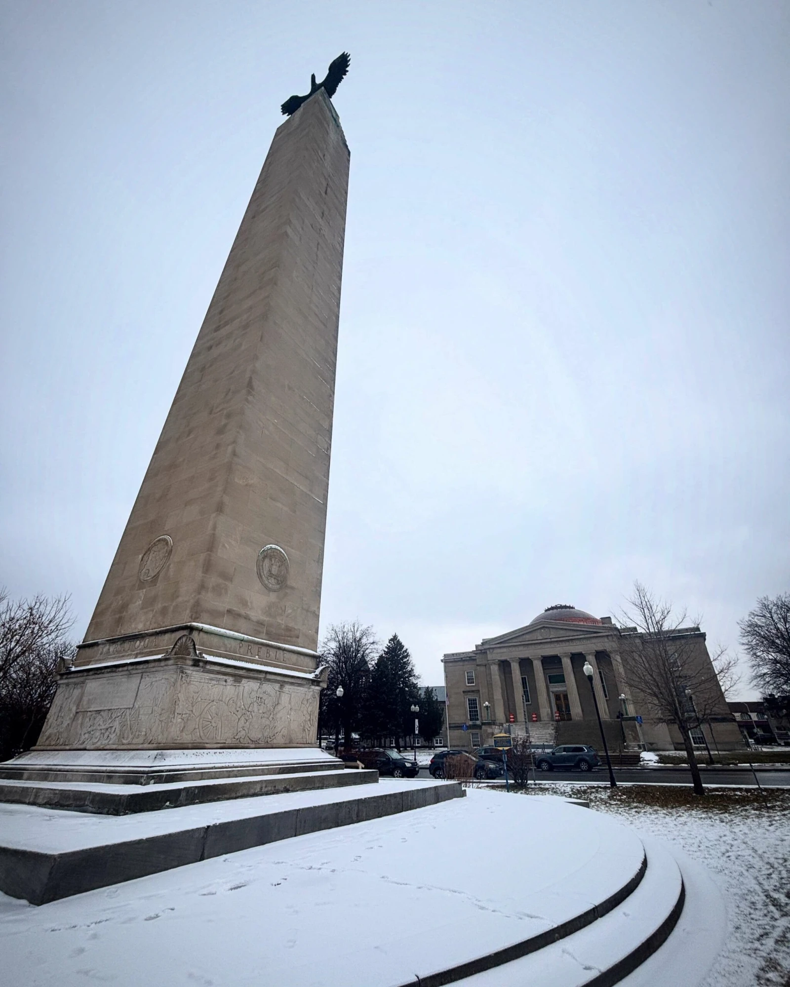 Je me gare directement à côté de la mairie de Plattsburgh. De l’autre côté de la rue, le monument Macdonough – érigé en l’honneur d’une vieille bataille – s’élève devant la rivière Saranac.