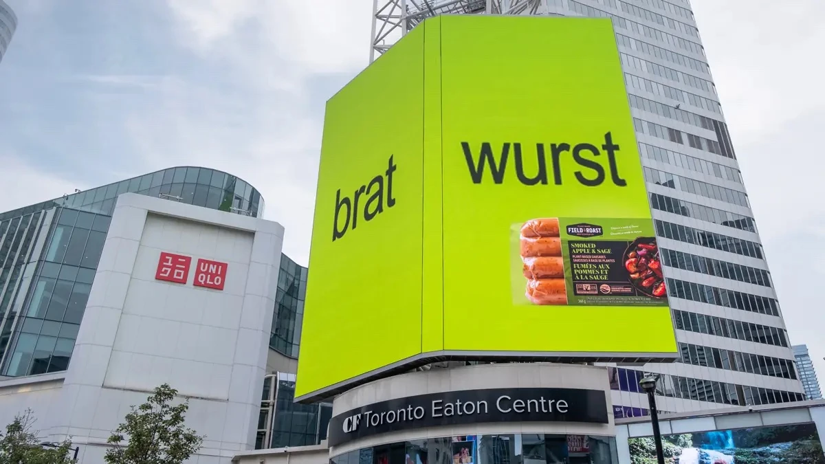 Même les panneaux géants du centre-ville de Toronto n’ont pu y échapper, illuminés à la fin du mois de juin par une publicité de saucisses vegan Field Roast aux couleurs brat.