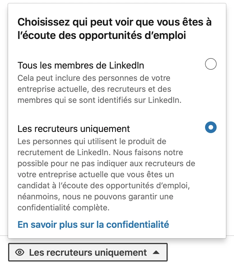 LinkedIn a maintenant une section où vous pouvez vous adresser uniquement aux recruteurs. C’est l’endroit parfait pour envoyer votre véritable intention si vous êtes ouverts aux propositions sans nécessairement être désespérés de changer d’emploi.