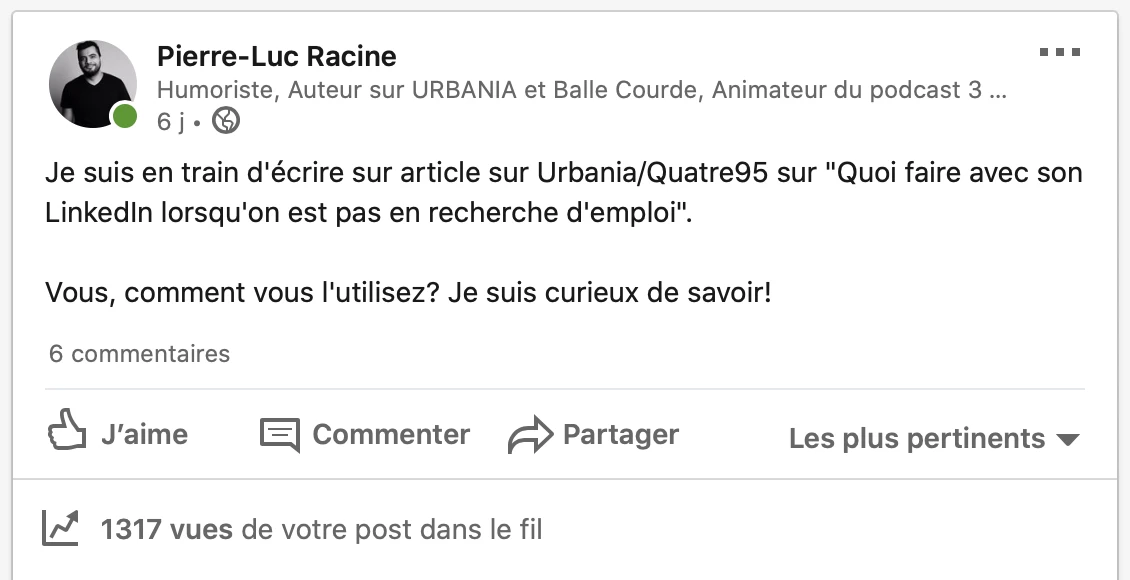 Toutefois, si ça marche pour vous, continuez cette recette gagnante! Personnellement, j’ai l’impression que tout ce que je fais sur LinkedIn passe à la trappe, ce qui me dérange et me décourage de l’utiliser, mais je devrais me forcer davantage.
