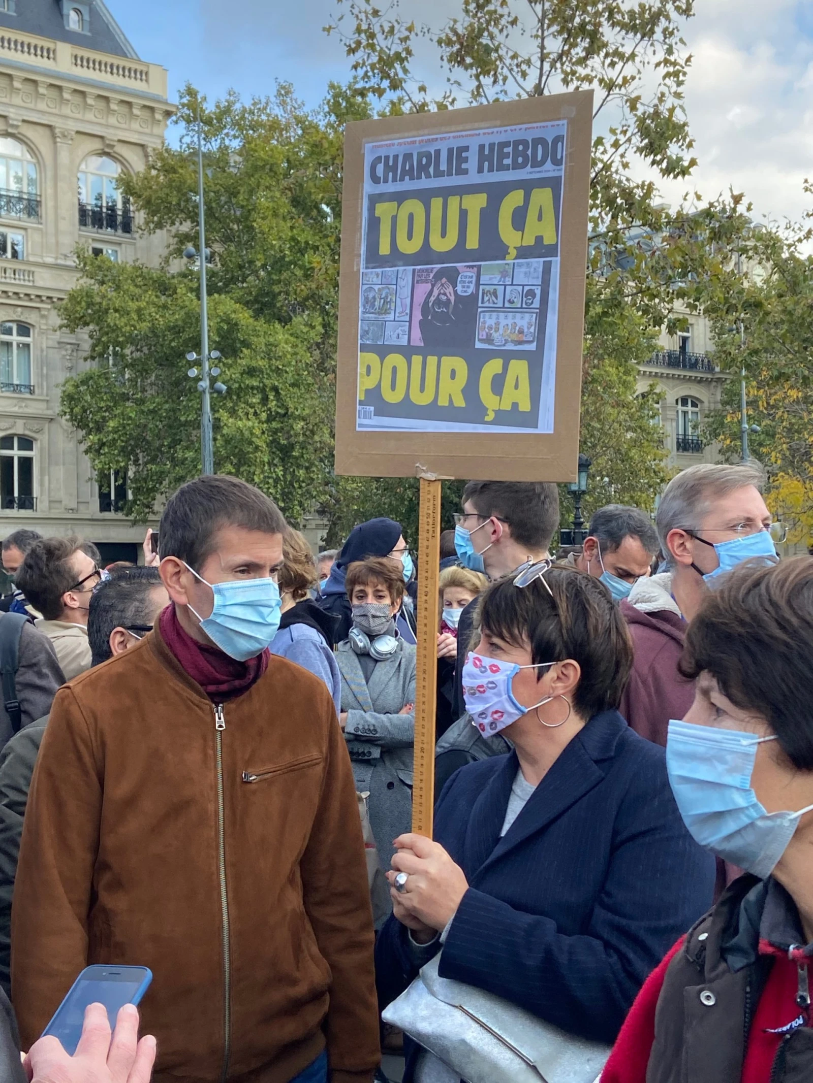 « On ne devrait pas mourir pour ça », scande Corinne, 47 ans. Accrochée au bras de son mari, elle est venue pour la République, pour la laïcité et pour la liberté de penser ce qu’elle veut, quand elle le veut. « Je suis sidérée, je ne pensais pas que ça recommencerait. On était déjà là en janvier 2015 et on pensait que ça serait la dernière fois. Mais s’il le faut, on reviendra, on sera toujours là pour se battre pour notre liberté d’expression, Samuel Paty n’avait pas à mourir pour avoir simplement exercé son métier ».