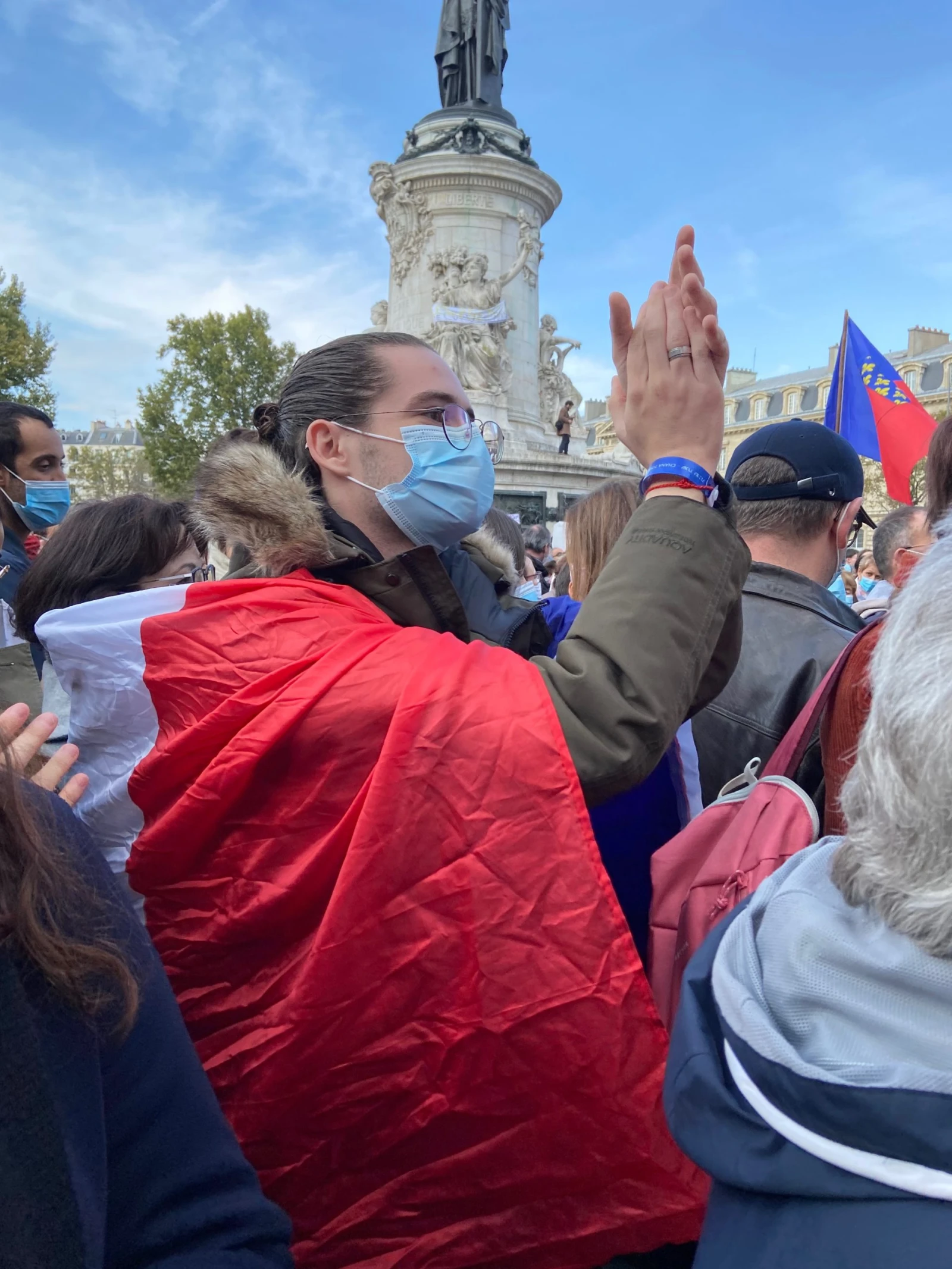 Antoine, 21 ans, le drapeau français bien enroulé autour de ses épaules, est venu avec ses amis pour soutenir cette profession endeuillée et exprimer son dégoût face à cet acte des plus barbares. « J’ai failli vomir quand j’ai appris qu’un homme s’était fait décapiter pour une affaire de liberté d’expression en France au 21èmesiècle. C’est extrêmement grave, un enseignant ne doit pas avoir à se demander s’il a le droit de parler de telle ou telle chose par peur de se faire trucider en sortant du lycée ».