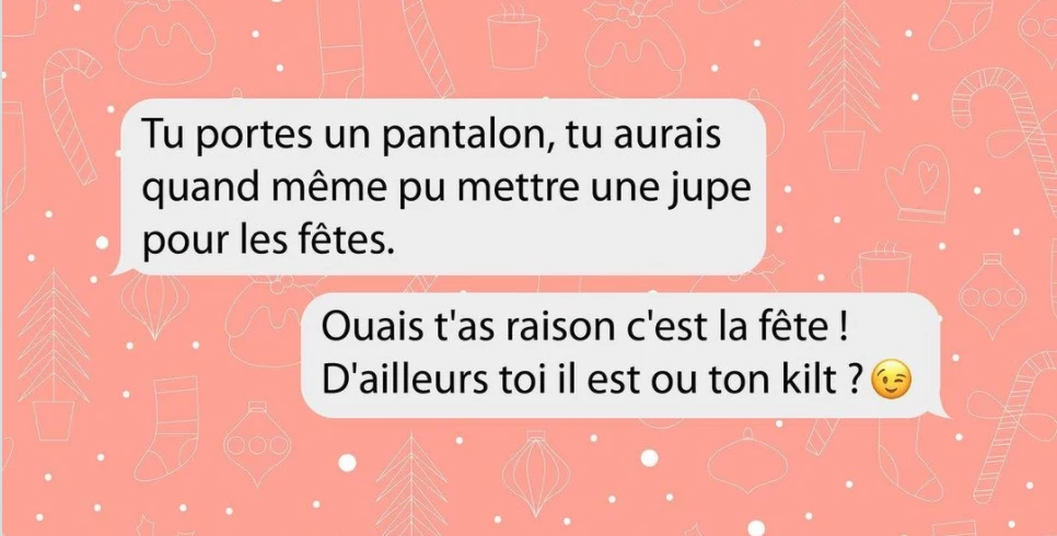 La répartie anti-sexisme ne repose pas non plus sur les mères. Si le show américain Yo Mama a fait des vannes commençant par « et ta mère » sa spécialité, n’oublions pas que les mères sont d’abord des femmes et qu’elles ne méritent aucunement ce flot d’insultes gratuites. D’ailleurs, on évite les insultes de façon générale, « d’autant que beaucoup sont étroitement liées au sexisme » souligne Marion. Mais ça, si vous ne voulez pas que le réveillon dégénère, vous savez déjà qu’il vaut mieux s’en passer.