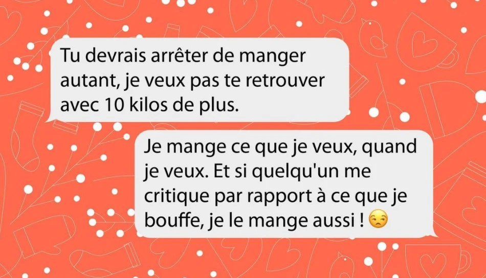 Les relous de nos familles font d’ailleurs tous les mêmes réflexions, ce qui permet finalement de mieux se préparer à ces moments-là. À Noël dernier, la créatrice de Punchlinettes remarquait ainsi la récurrence de trois thèmes dans les témoignages qu’elle a reçus. « On m’a beaucoup parlé de sujets d’actualité, et de comparaisons sur les droits des femmes entre différents pays ainsi que du corps féminin, avec des remarques sur l’épilation, ou cet oncle qui fera un commentaire sur la poitrine plus développée de sa nièce. Sans surprise, les témoignages les plus fréquents concernaient « les femmes célibataires ou les couples sans enfant ». Mais pour faire comprendre à ses proches qu’on est très bien seule, mieux vaut éviter la sortie de route.