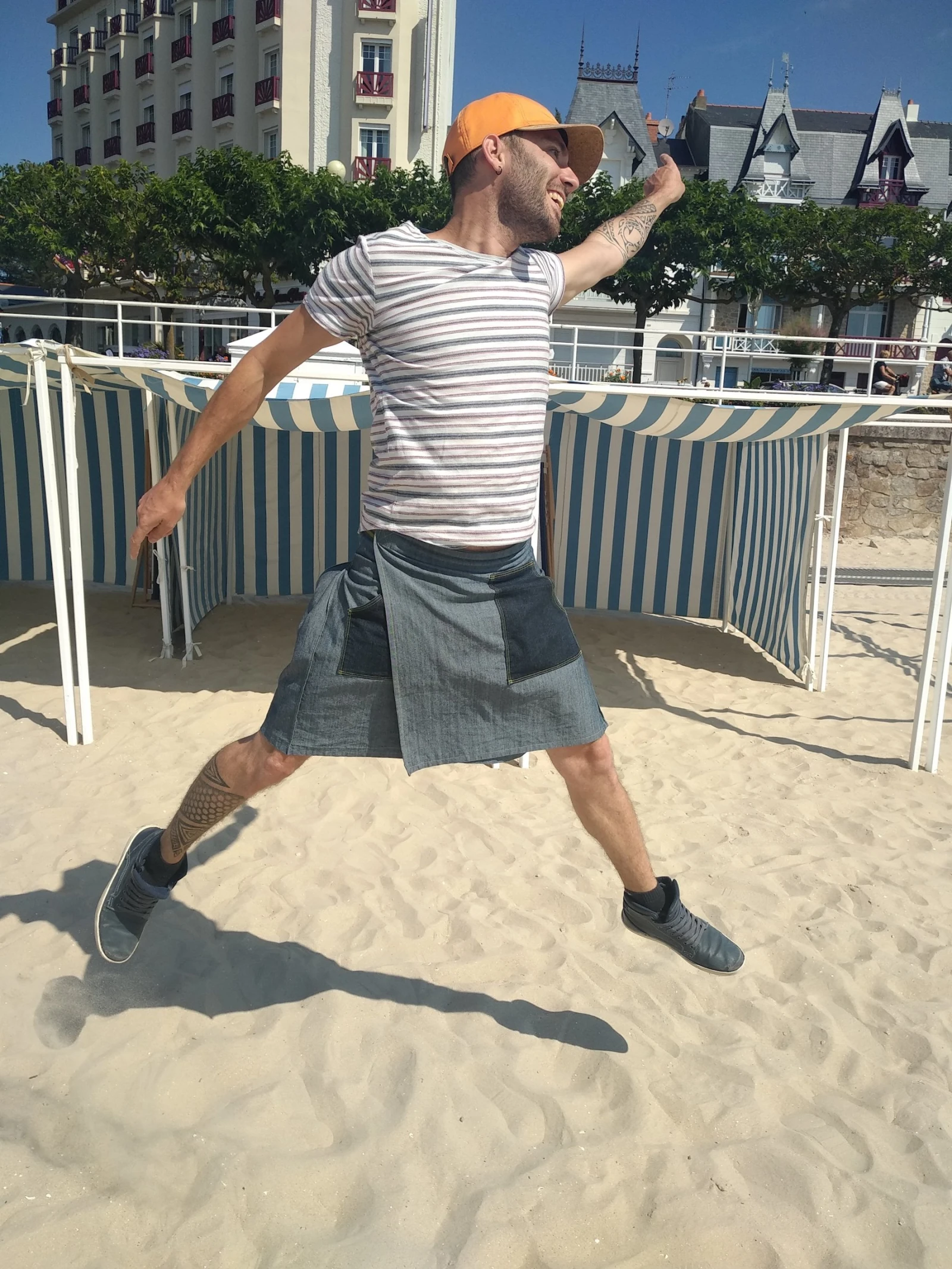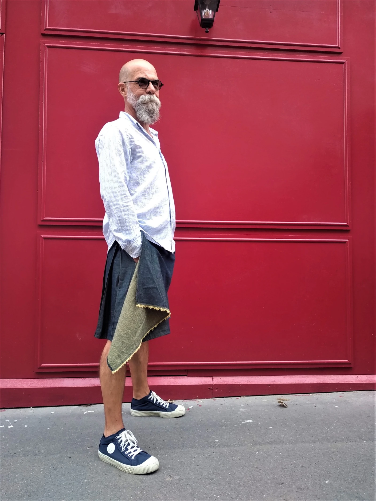 Le créateur m’a raconté que son idée de réinventer la jupe a commencé à germer vers ses 17 ans quand l’envie de tester le kilt lui a titillé l’esprit. « Une connaissance m’en a prêté un, j’ai pu le mettre en festival, et durant une semaine de vacances d’été. J’ai adoré la sensation de liberté éprouvée, de ne pas être contraint par le tissu entre les jambes, c’était top. Une vraie nouveauté niveau sensationnel. »