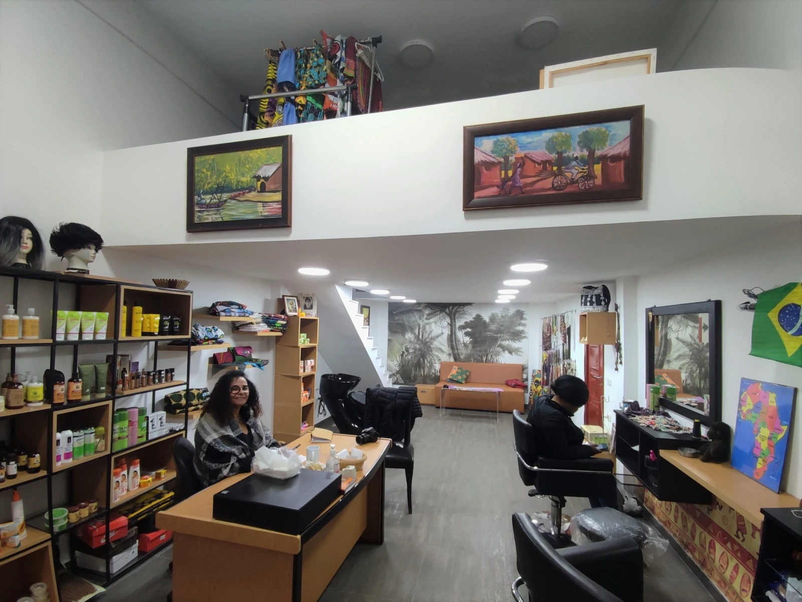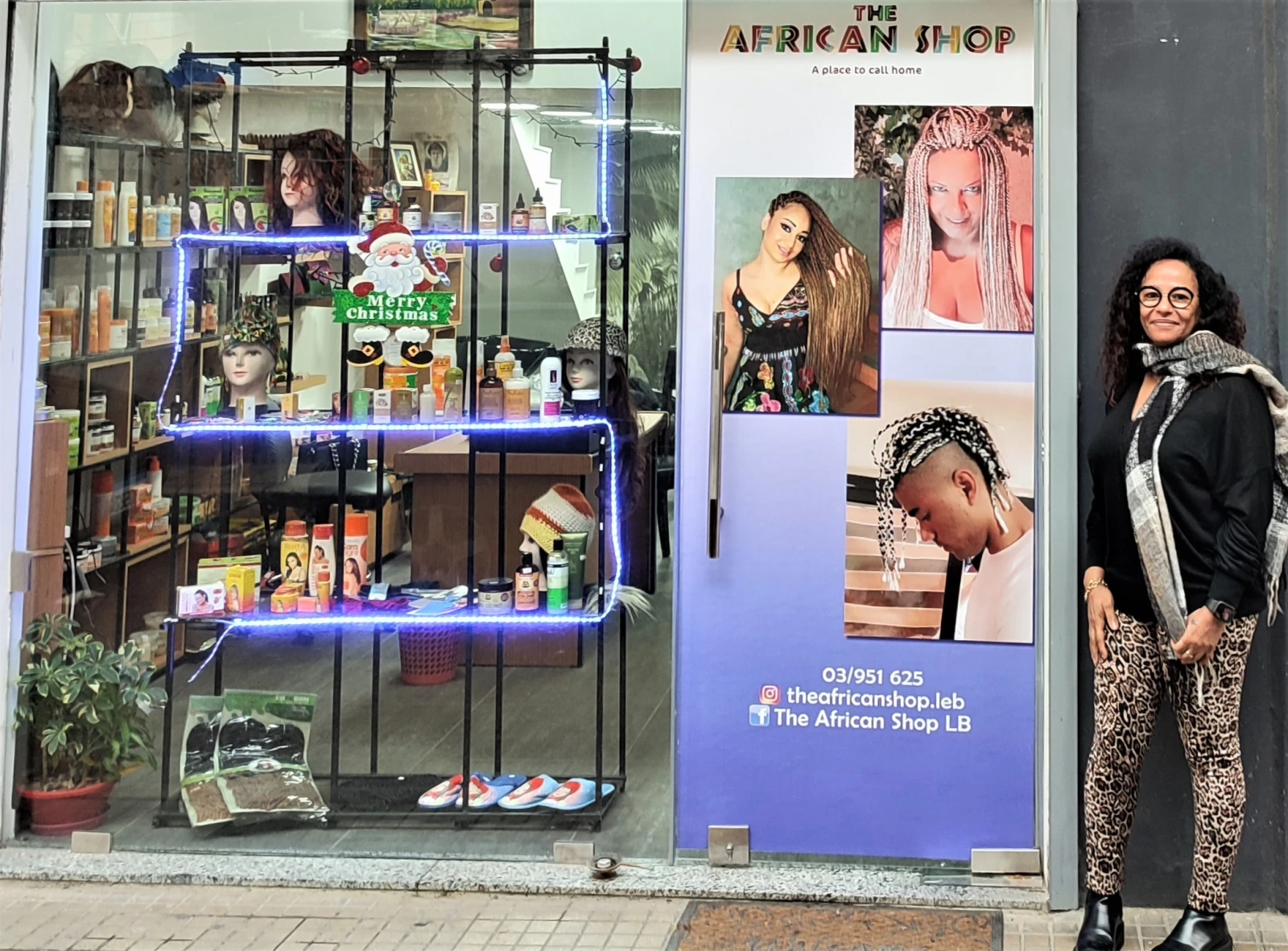 Le loyer ayant trop augmenté, elle déménage quelques rues plus loin, en novembre 2022. Mais la recette reste la même. À l’intérieur, il y a un salon de coiffure ainsi que des produits pour les cheveux frisés : des tresses, perruques, crèmes, shampoings ; du maquillage pour peaux noir foncé et claires ; des vêtements africains avec jupes, hauts, pantalons ; des accessoires ; de la nourriture comme du gari, du piment, du yam ou encore de l’huile. Il y a même des tableaux faits par un artiste et ami de la famille, ainsi que des livres.