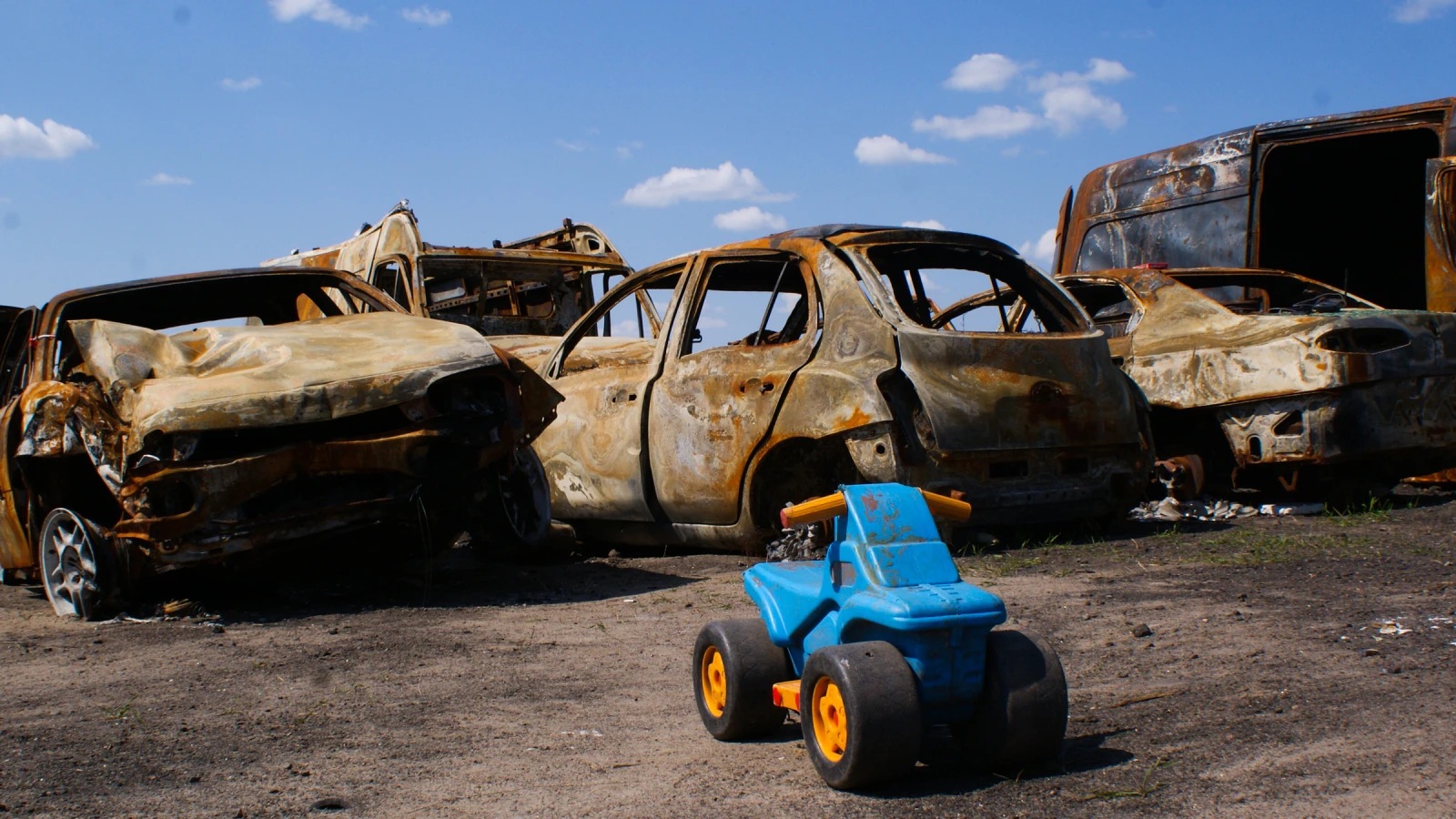 Malgré le fatalisme du couple et le chaos apparent, la vie reprend pourtant le dessus. À quelques dizaines de mètres de là, des employés municipaux lorgnent sur un autre édifice et débattent de sa potentielle destruction. Les magasins rouvrent, timidement, souvent sans porte ou fenêtre, mais ils rouvrent. De l’autre côté de la rue, les insignes « V », les têtes de mort, mais surtout les inscriptions « міни » (comprenez « mines ») n’ont pas disparu d’un toboggan que quelques enfants dévalent tour à tour. Pas par grappes, mais il y en a, sourire aux lèvres, tout comme leur mère qui les regarde. Symbolique, mais bien réel. De symbole, il y en a un devant eux, sur la place centrale, illustrant la situation. La tête de Taras Chevtchenko, icône de la culture ukrainienne, en partie détachée de son buste et impactée par deux balles en plein front, s’incline dangereusement, mais ne tombe pas. À ses pieds, sur un carreau de granite détaché du monument, les vers du poète : « Aimez votre Ukraine / Aimez-la… / Dans les moments féroces / Dans la dernière minute difficile / Priez le Seigneur pour elle ! ».