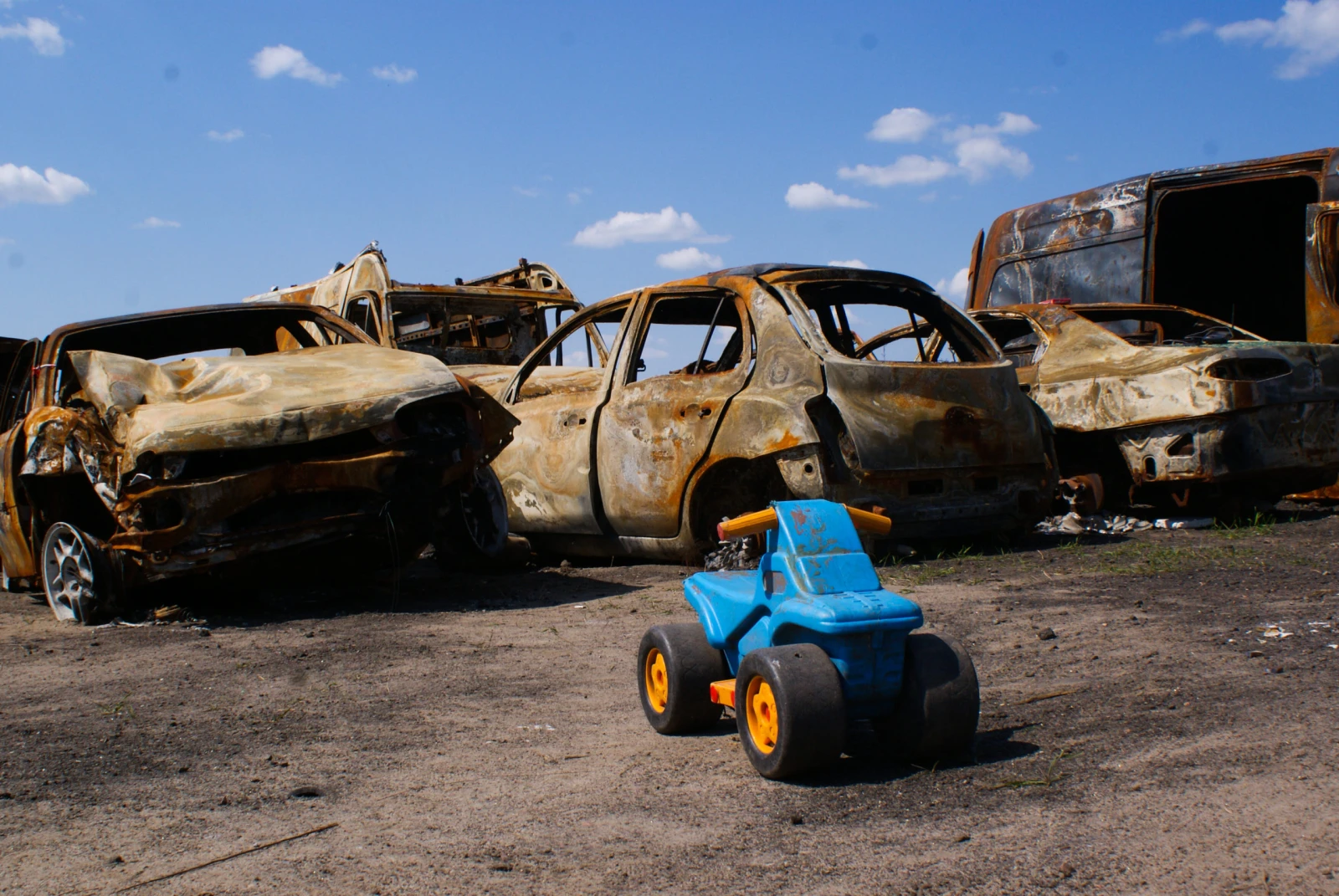 Ceux qui sont de retour — environ la moitié des 60 000 habitants de la ville — se pressent sur un parking où les véhicules détruits ont été entreposés, pour tenter de retrouver les restes de leur voiture, au mieux criblée de balles, au pire calcinée. C’est la même odeur âcre de taule brûlée qui s’empare d’un terrain vague de la ville martyre de Boutcha. À quelques centaines de mètres de l’église orthodoxe St. Andrew, dont les jardins ont servi de charnier au cours de l’occupation russe, un fils prend la pose, fier, devant l’appareil photo de son père, debout sur un char ennemi. Enfin vient Hostomel, capturée dès les premiers jours de la guerre par les troupes du Kremlin, pour bénéficier de son aéroport en vue d’un assaut sur Kyiv. Là, les employés communaux sont déjà à pied-d’oeuvre pour refaire les routes sous un soleil de plomb. « Ici, la zone est sécurisée, précise l’un d’eux. Maintenant vient le second défi : reconstruire. Les routes et ponts en priorité. Ce ne sera pas le plus difficile. »