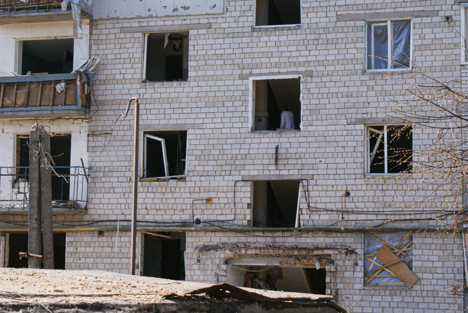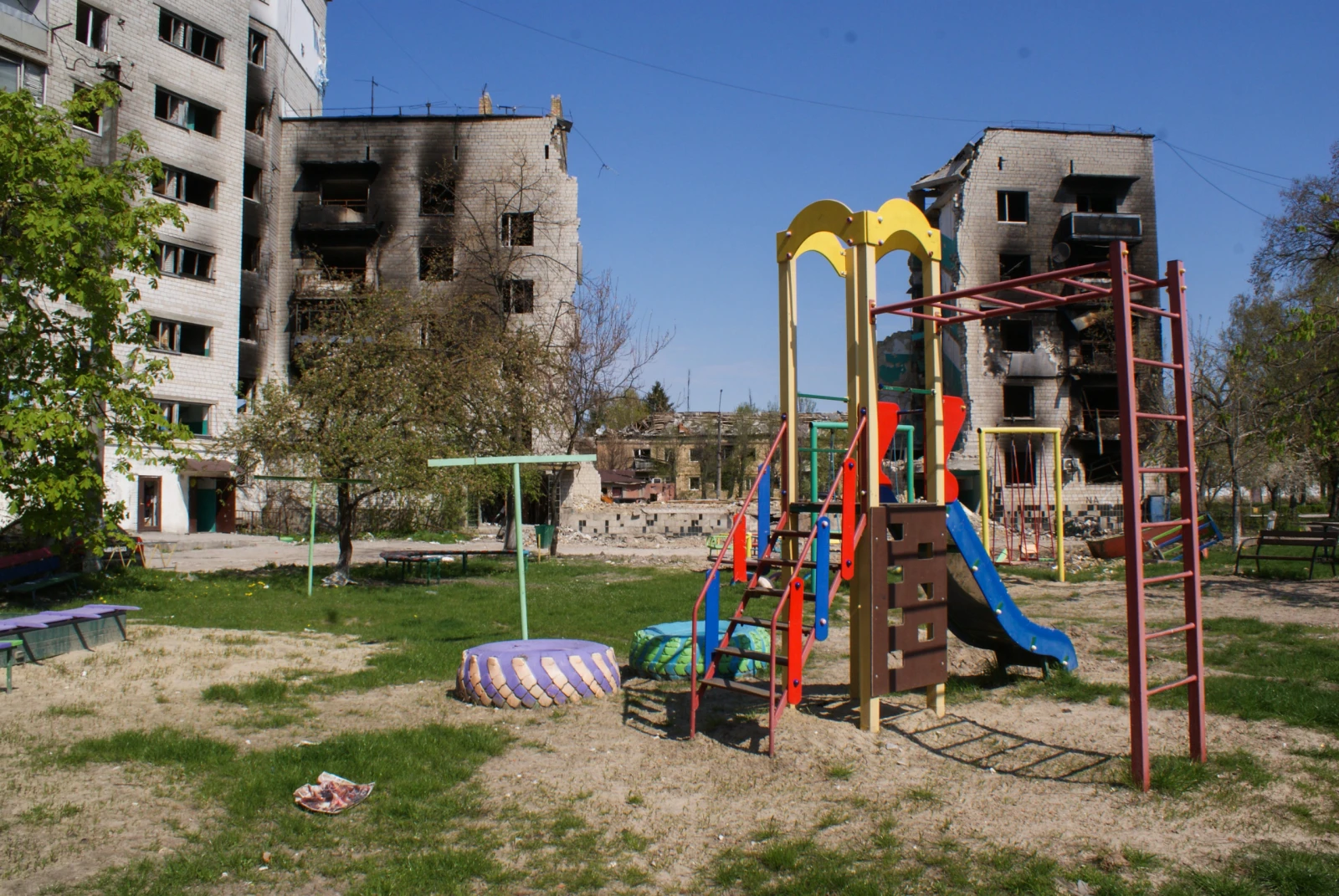 « La ville la plus détruite de la région de Kyiv », selon Iryna Venediktova, procureur générale d’Ukraine. L’avenue principale, qui portait encore le nom de Lénine il y a sept ans, avant que le parlement ne vote les lois de décommunisation, est désormais emblème de désolation. « Ils n’ont rien épargné. Regardez le commissariat ici, ils l’ont occupé et brûlé avant de partir. Là, c’est la mairie, entièrement détruite. Nous avons aussi dû faire tomber l’école, qui menaçait de s’effondrer. Mais le pire ce sont les logements », soupire Alexander. Il est vrai que les Khrouchtchevka chancèlent. Au mieux, ces barres de briques construites en série dans les années 1960 par l’Union Soviétique ont été noircies et fissurées par les explosions environnantes. Au pire ces dortoirs de béton sont éventrés, lorsqu’ils ne sont pas effondrés. Devant l’un d’eux, seul un berger allemands rompt le silence en aboyant de temps à autre.
