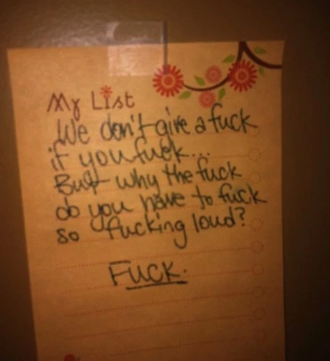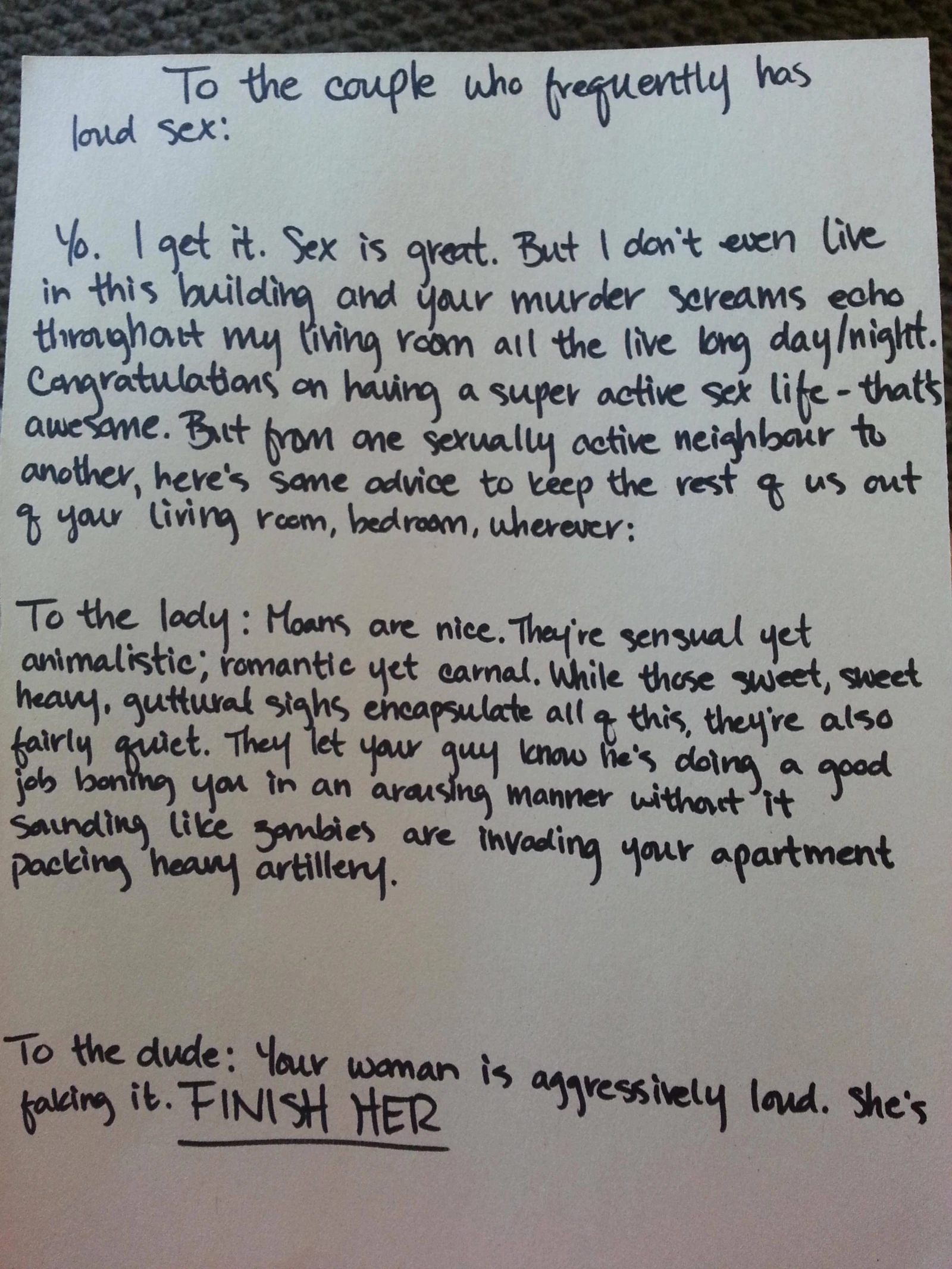 La présente est pour vous signifier mes plus sincères félicitations pour vos orgasmes multiples, mais vu les murs de carton, je vous entends chaque soir si fort que cela m’empêche de dormir/scroller Instagram/pleurer sur This Is Us. Auriez-vous s’il vous plaît l’amabilité de considérer faire moins de bruit lors de vos prochains ébats? Veuillez croire en mon estime la plus flamboyante, respect, paix et licornes, bien à vous,
