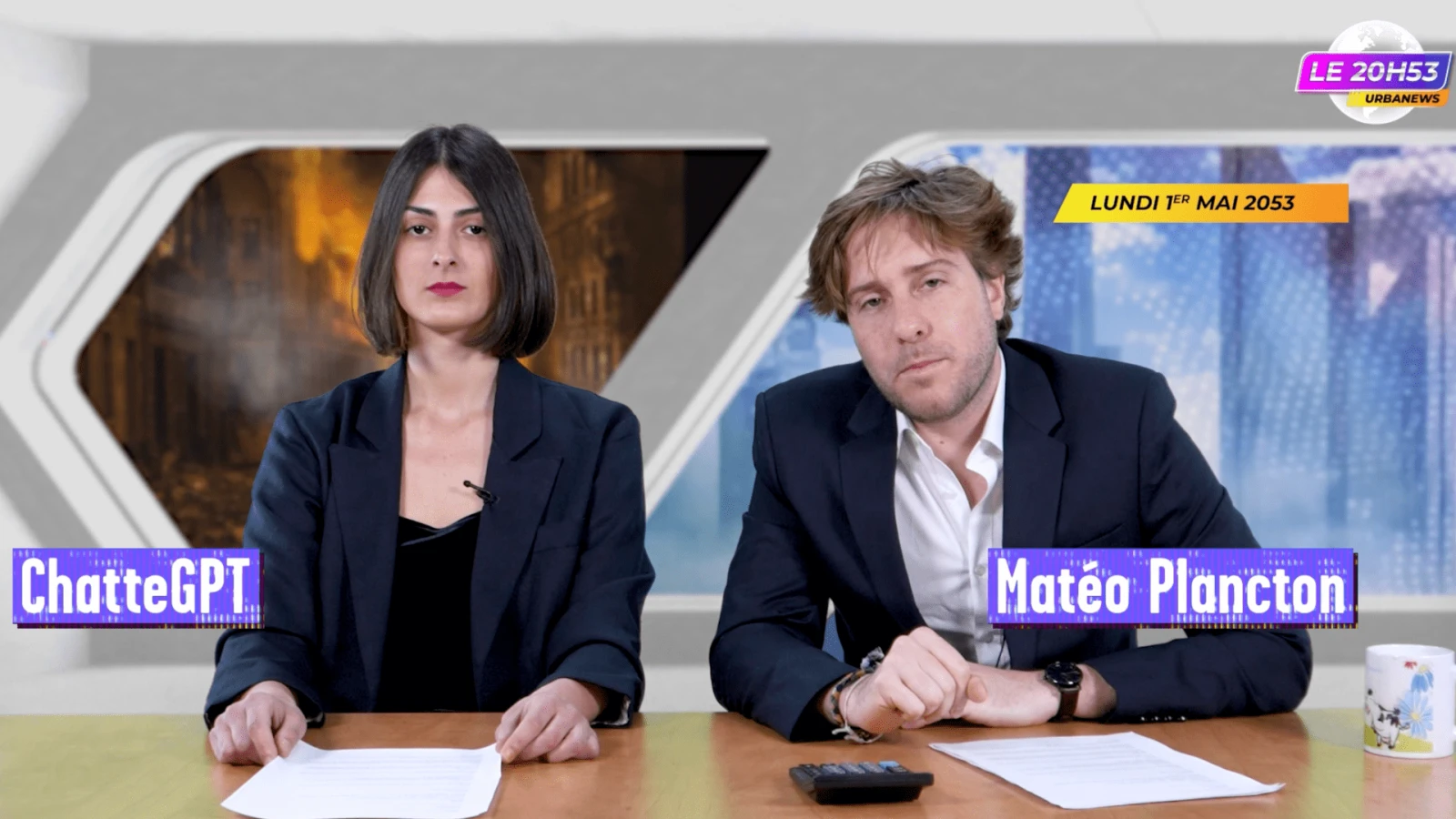 Bonjour à toustes, nous sommes le 1er mai 2053 sur URBANEWS, voici votre seconde édition du 20h53 présentée par Matéo Plancton et ChatteGPT en pleine crise existentiello-artificielle.